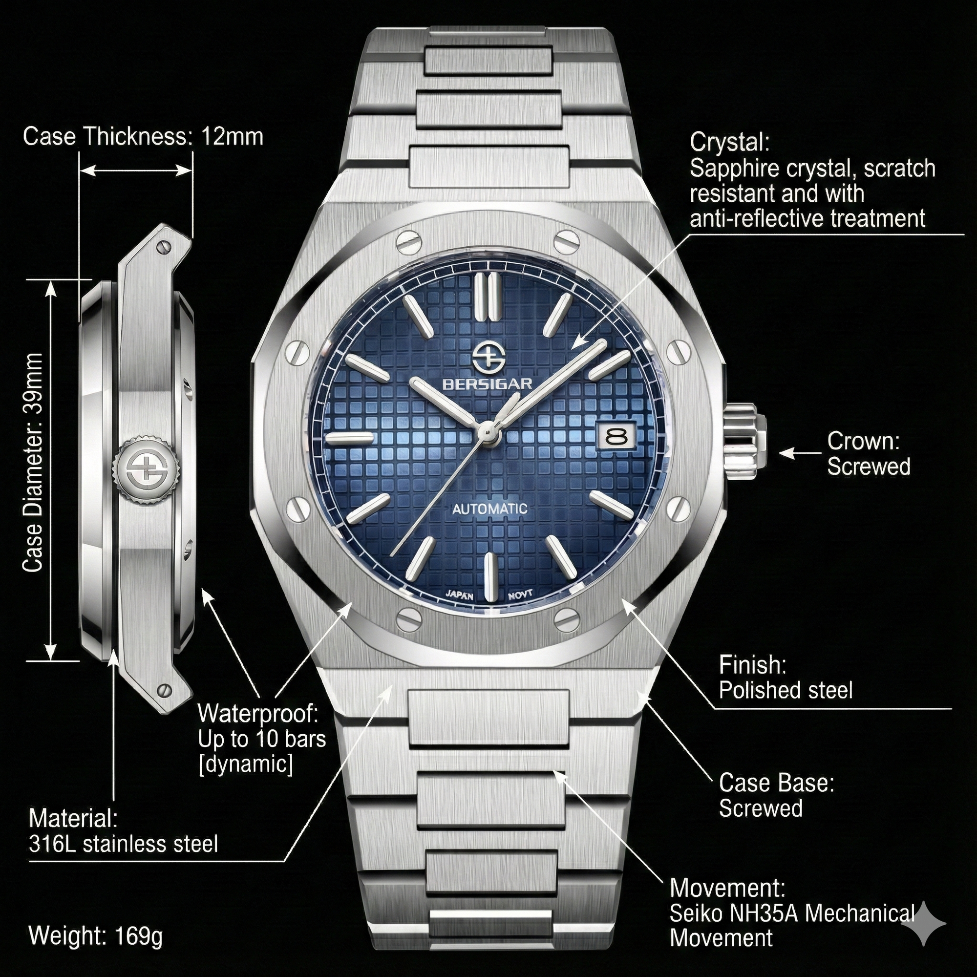 Quality Japanese Seiko NH35A automatic mechanical movement, very accurate timekeeping, self-winding, and the power of the spring can reserve more than 36 hours. Its architecture, manufacturing and innovative features make it exceptionally precise and reliable.