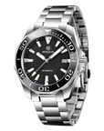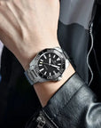 Hochwertige Materialien und lässiges Design, Saphir- Zifferblattfenster, Volledelstahlkonstruktion mit verschraubter Krone, gegen den Uhrzeigersinn drehbare Keramiklünette und transparenter Gehäuseboden, solides und flexibles Uhrenarmband mit klassischer Faltschließe oder Echtlederarmband mit Dornschließe.