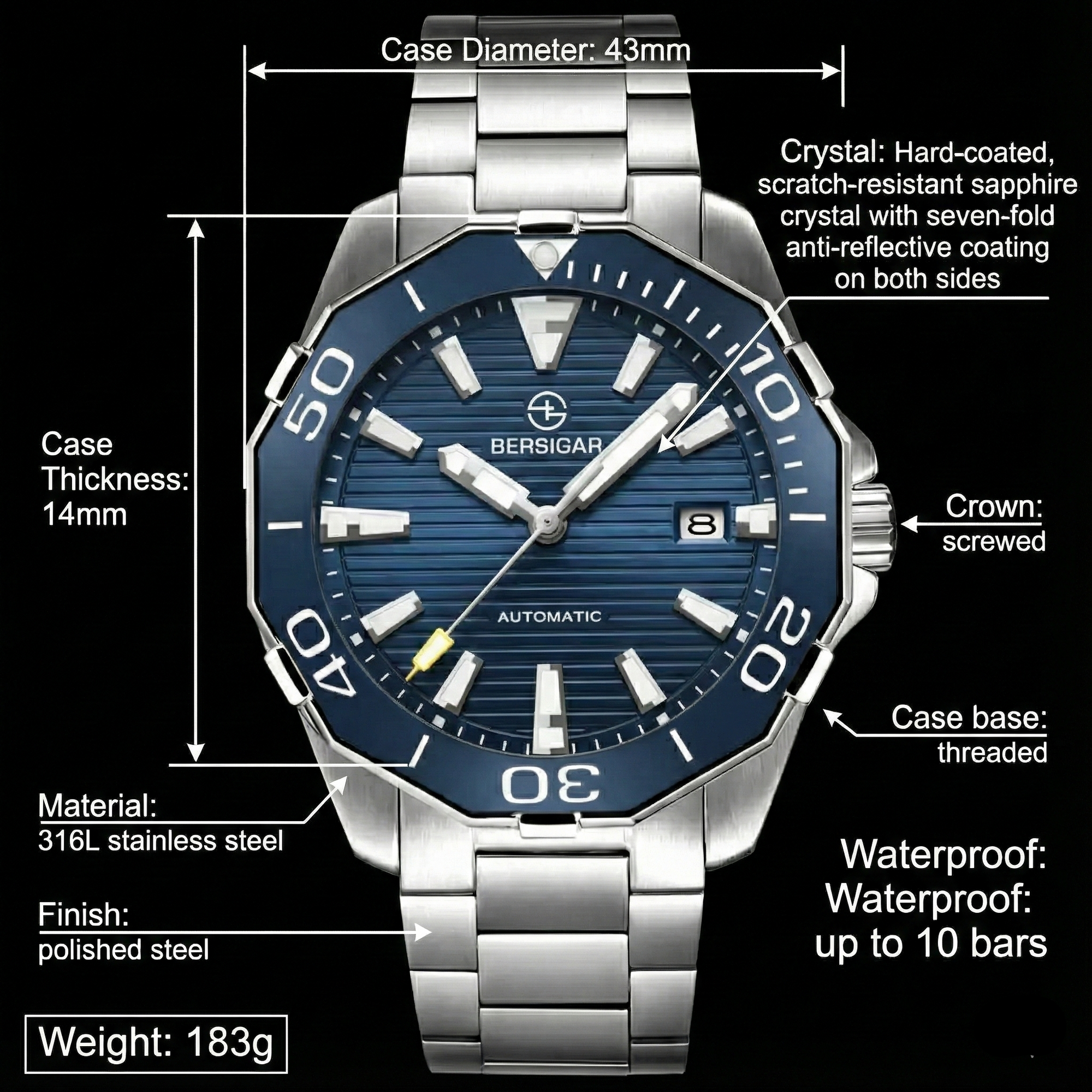 Water resistant to 100 m (330 ft), In general, suitable for professional marine activity and serious surface water sports, but not scuba diving, The crown would need to be pushed in and then screwed down in order to protect the watch from water damage