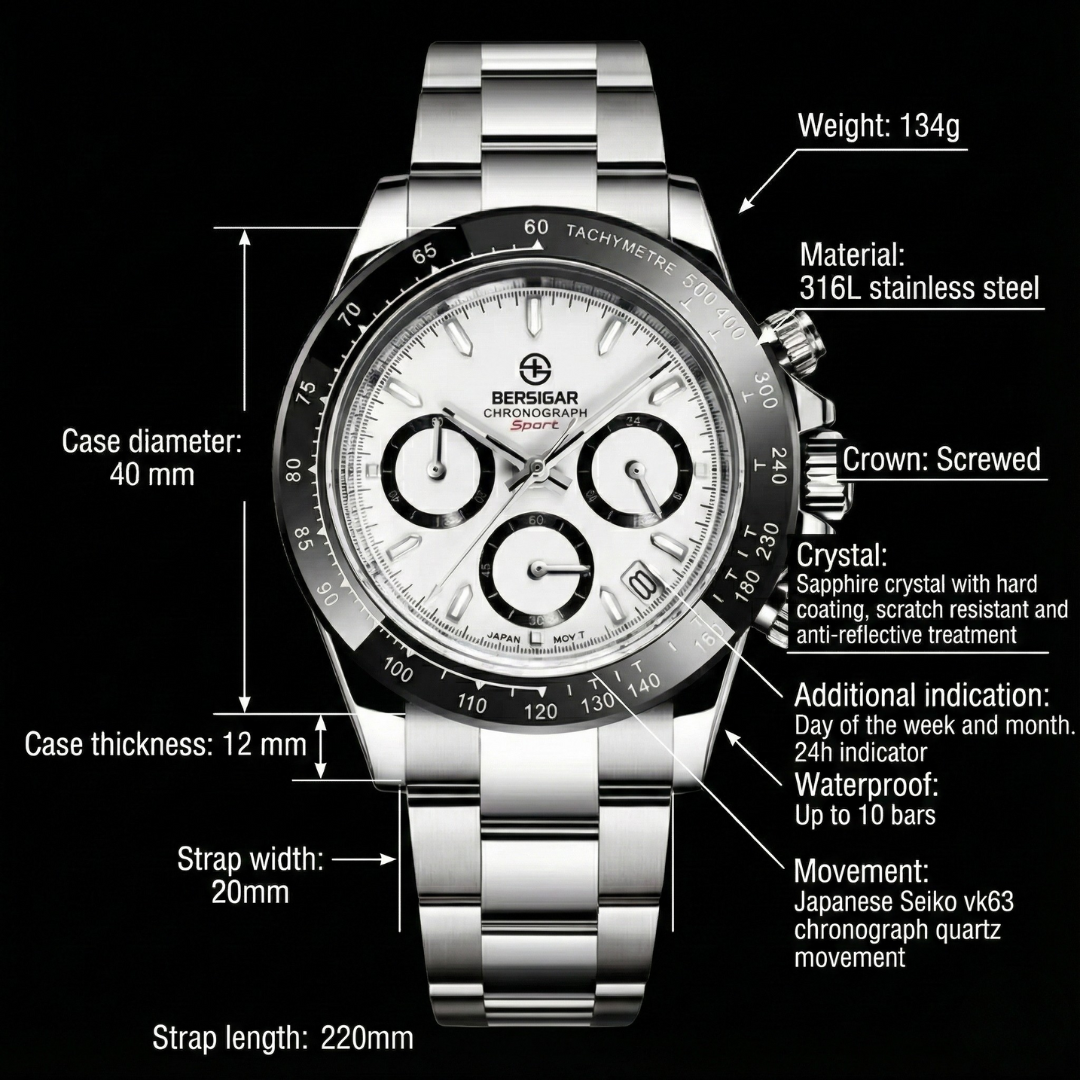 Quality Japanese Seiko vk63 chronograph quartz movement, very accurate timekeeping. Its architecture, manufacturing and innovative features make it exceptionally precise and reliable.