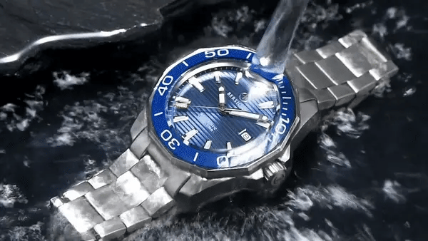 Résistant à l'eau jusqu'à 100 m (330 ft), en général, convient pour les activités maritimes professionnelles et les sports nautiques de surface sérieux, mais pas pour la plongée sous-marine, la couronne devrait être enfoncée puis vissée pour protéger la montre des dommages causés par l'eau