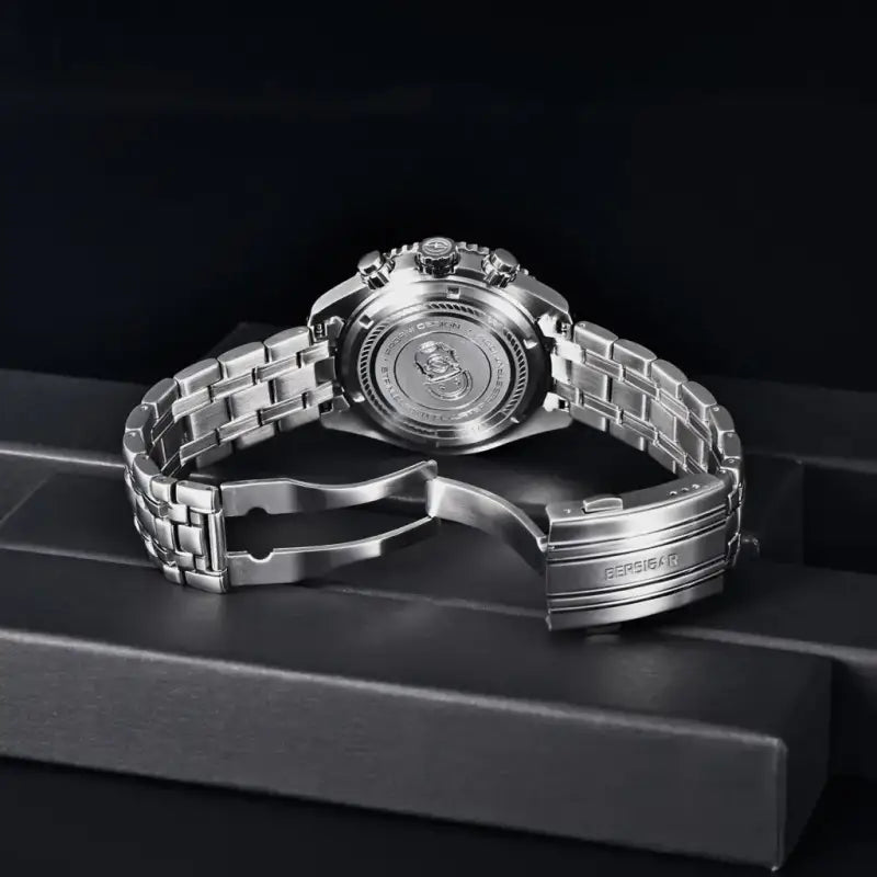 Materiali premium e design casual, vetro del quadrante in zaffiro, costruzione in acciaio inossidabile, retro del caso solido, braccialetto in acciaio solido e flessibile con classica chiusura a farfalla