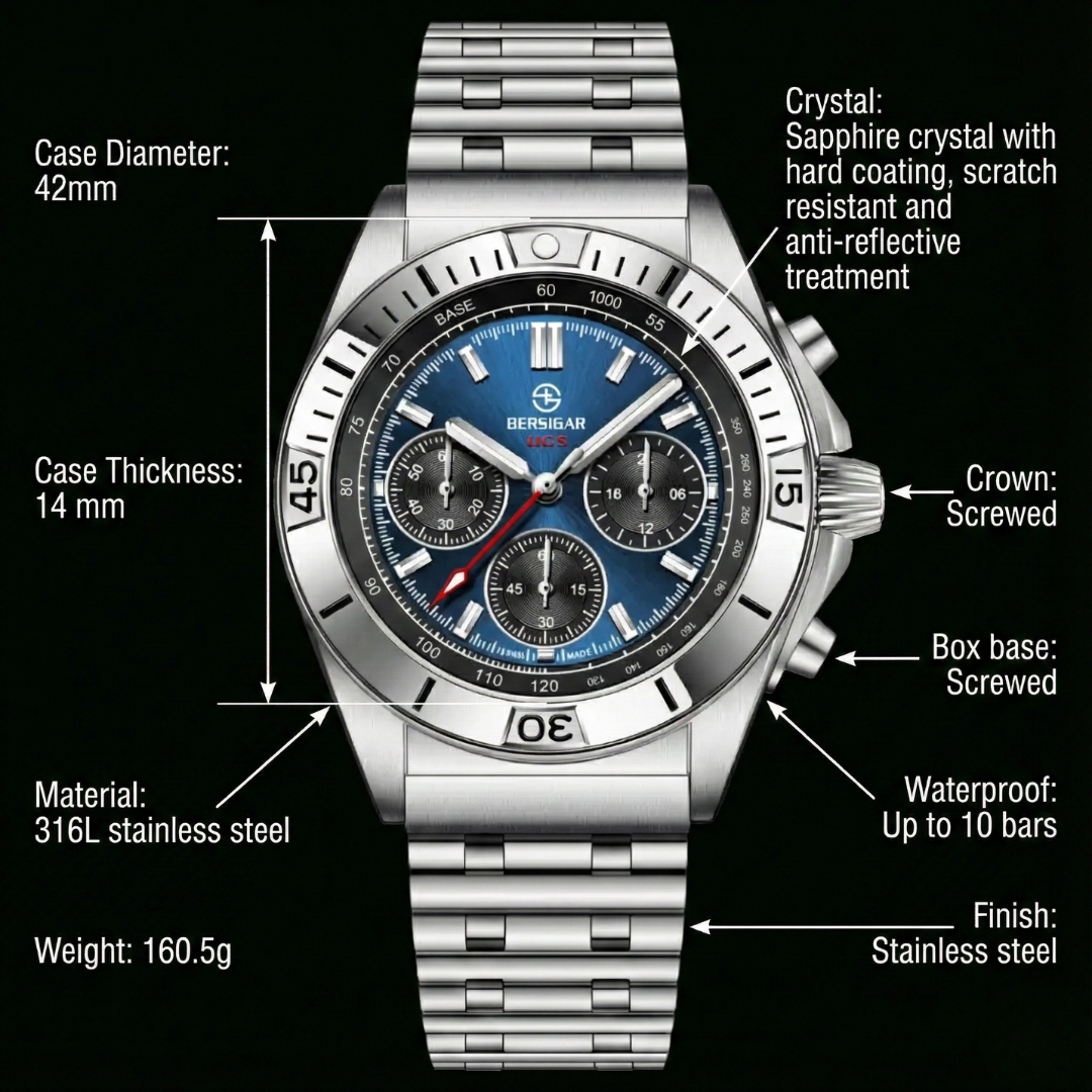 Quality SEIKO vk63 chronograph quartz movement, very accurate timekeeping. Its architecture, manufacturing, and innovative features make it exceptionally precise and reliable.
