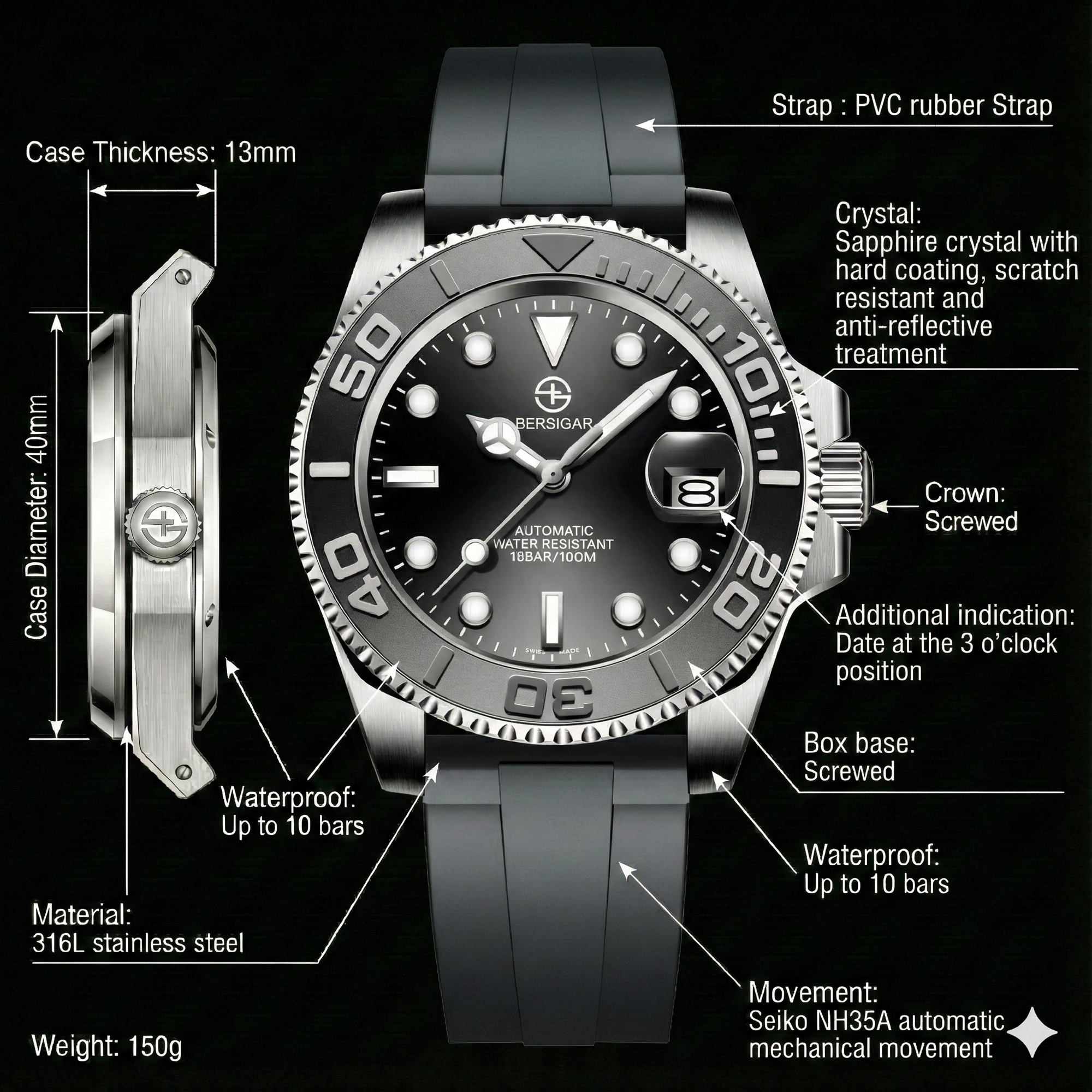 Water resistant to 100 m (330 ft), In general, suitable for professional marine activity and serious surface water sports, but not scuba diving, The crown would need to be pushed in and then screwed down in order to protect the watch from water damage