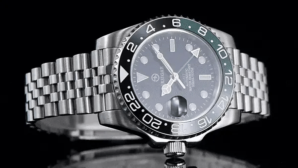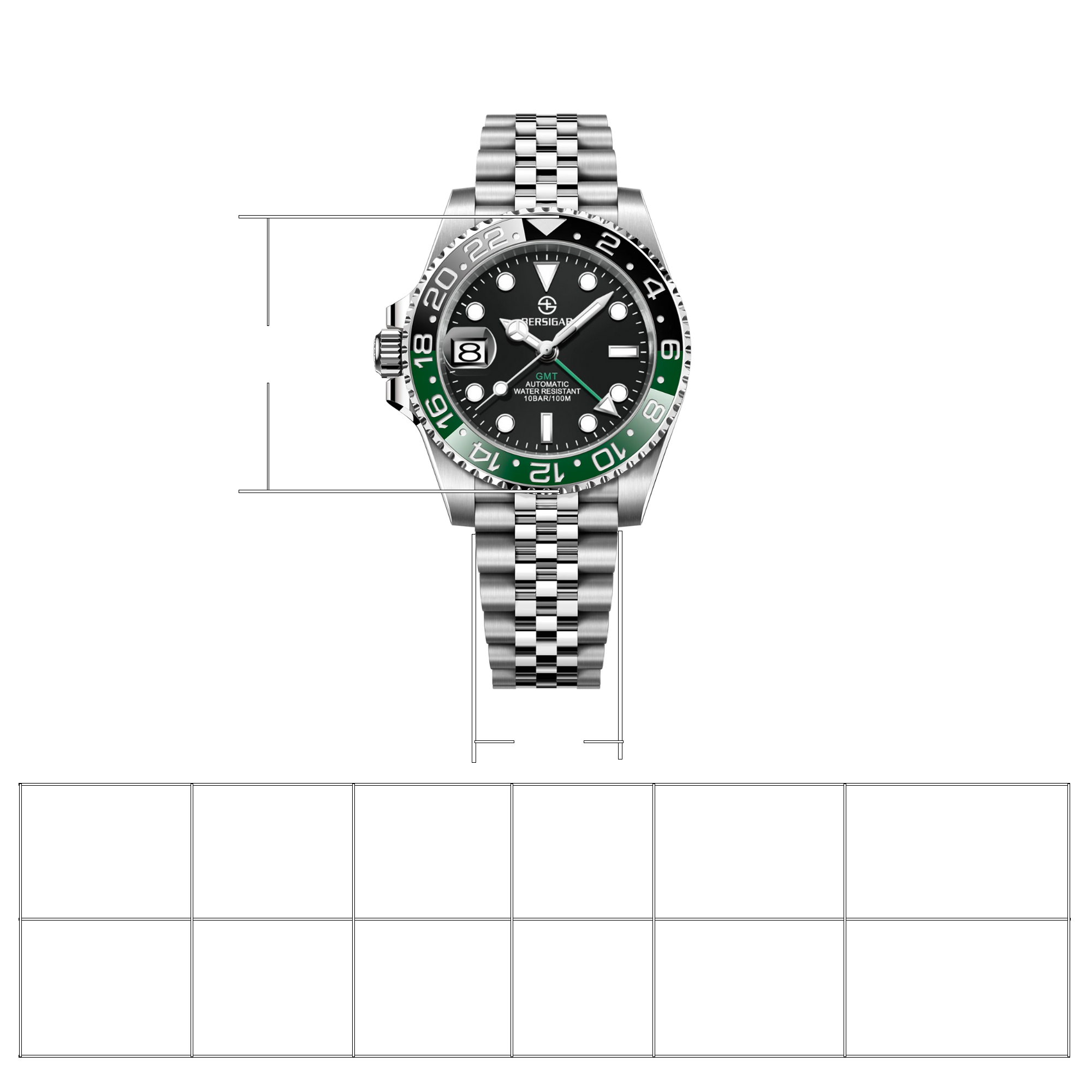 Materiali premium e design casual, vetro del quadrante in zaffiro, costruzione completa in acciaio inossidabile 316L con corona a vite, ghiera in ceramica che può essere ruotata in senso antiorario e fondo del caso trasparente, braccialetto Jubilee solido e flessibile con un classico fermaglio a farfalla