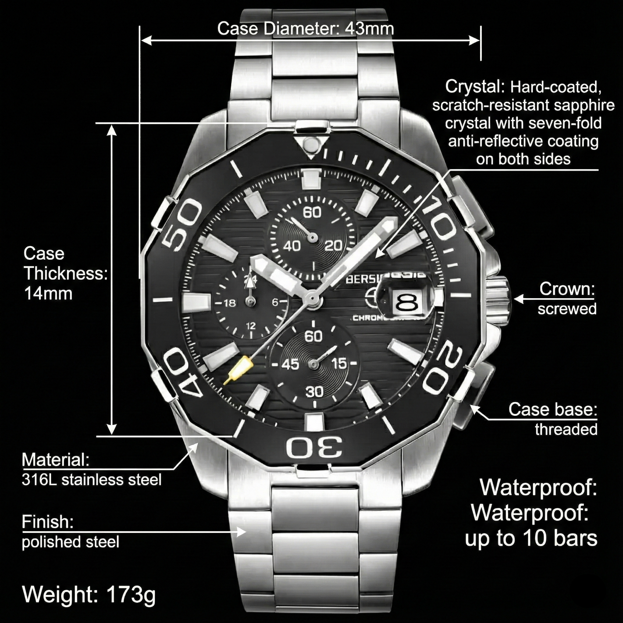 Premium materials and casual design, Hardlex dial window, full 316L stainless steel construction with screw-down crown,ceramic bezelcan be rotated counterclockwise, solid and flexible watchband with classic fold-over clasp