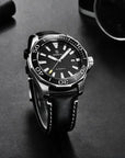 Materiali premium e design casualSaffiano finestra del quadrante, costruzione completamente in acciaio inossidabile cona vite corona, la ceramica può essere ruotato in senso antiorario e cassa trasparente sul retro, cinturino solido e flessibile con classica chiusura a farfalla o cinturino in pelle genuina con fibbia