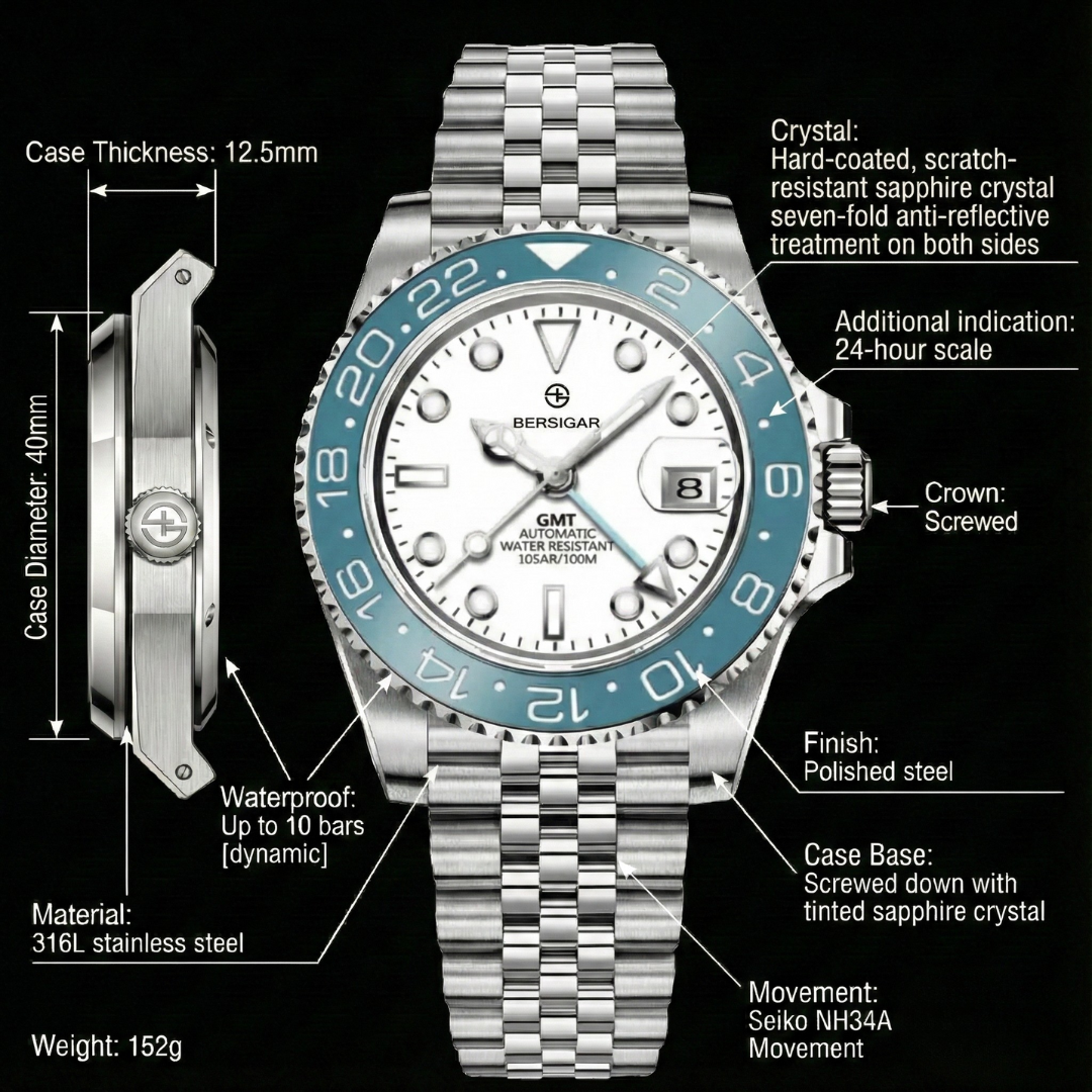 Top-quality SEIKO NH34A GMT automatic movement, very accurate timekeeping, self-winding and the power of the spring can reserve more than 36 hours.