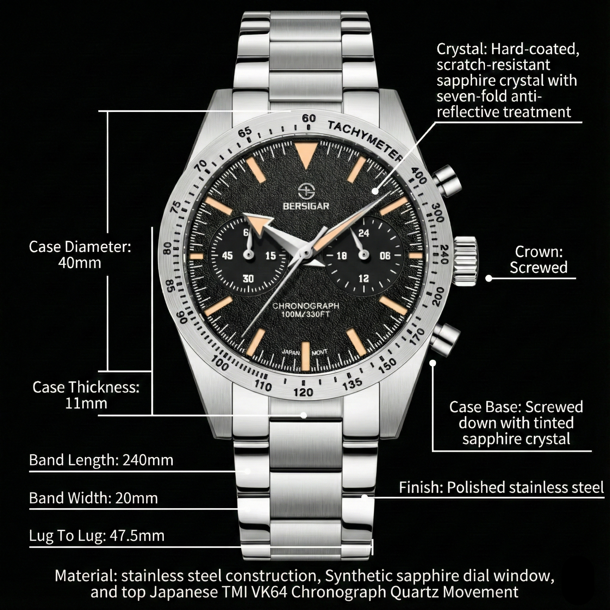 Water resistant to 100 m (330 ft), In general, suitable for professional marine activity and serious surface water sports, but not scuba diving, The crown would need to be pushed in and then screwed down in order to protect the watch from water damage