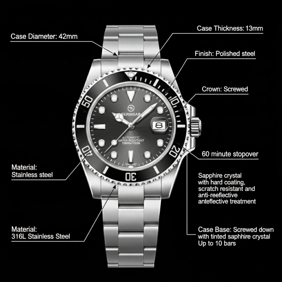 Water resistant to 100 m (330 ft), In general, suitable for professional marine activity and serious surface water sports, but not scuba diving, The crown would need to be pushed in and then screwed down in order to protect the watch from water damage