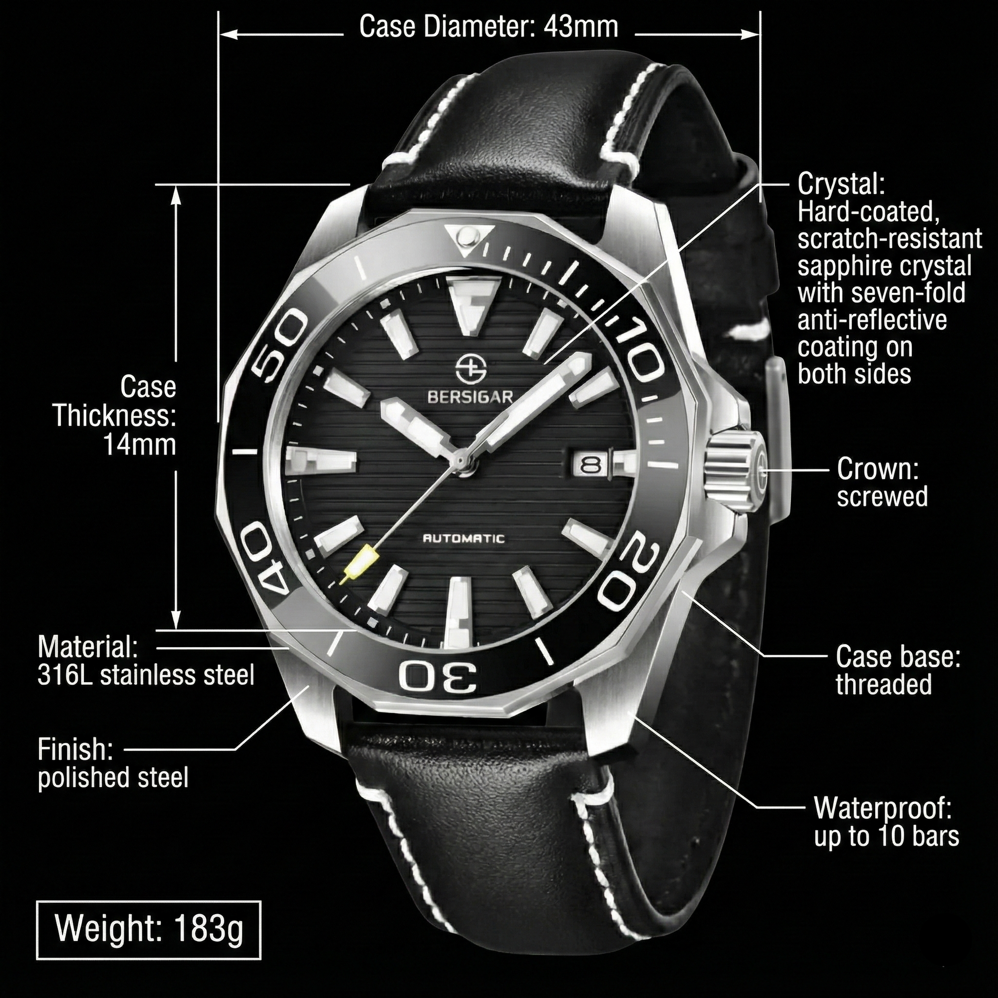 Water resistant to 100 m (330 ft), In general, suitable for professional marine activity and serious surface water sports, but not scuba diving, The crown would need to be pushed in and then screwed down in order to protect the watch from water damage